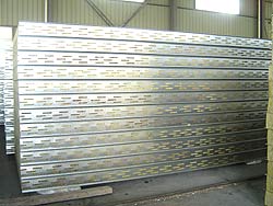 【材料适用】1.上/下钢板厚度:0.4~0.8mm彩色钢板/电、热镀锌板/不锈钢板2.芯材:(矿)岩棉容量为120~150kg/m33.侧边钢带:0.4mm~0.8mm镀锌板【产品规格】1.企口式有效宽度:950mm、1150mm;2.厚度50mm~150mm;长度不限【产品特性】1.优点:耐火性能好,隔音、隔热较好,安装简便、高效。2.消防等级:A级【适用领域】广泛适用于涂装钢结构厂房、烘干涂装机械设备、简易活动房的屋面、墙体、空气洁净室的吊顶与隔断。 |